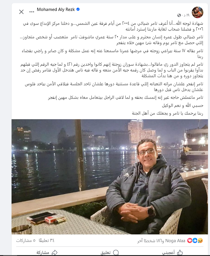 وقال محمد علي رزق في منشور عبر حسابه على موقع فيس بوك، إنه يعرف تامر منذ عام 2004، وعلى مدار عشرين عامًا لم يرَ منه أي تجاوزت، متابعا: شهادة لوجه الله.. أنا أعرف تامر ضيائي من 2004 من أيام فرقة عين الشمس، ودخلنا مركز الإبداع سوا في 2006 وفضلنا صحاب لغاية ما ربنا استرد أمانته، وتامر ضيائي طول عمره إنسان محترم وعلى مدار 20 سنة عمري ما شوفته متعصب أو شخص متجاوز، اللي حصل مع تامر يوم وفاته شيء مهين خلاه ينفجر.