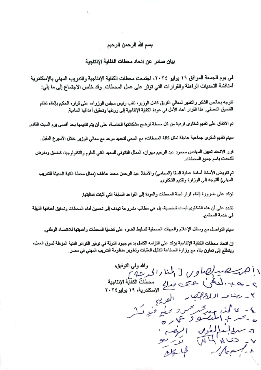 كما تمثلت القرارات في عدم تنفيذ قرار وزير الصناعة بإلغاء قرار لجنة المحطات التعسفي، مؤكدين أن هذه الممارسات، بحسب المجتمعين، تعرقل العملية التعليمية وتهدد مستقبل التدريب المهني في مصر.