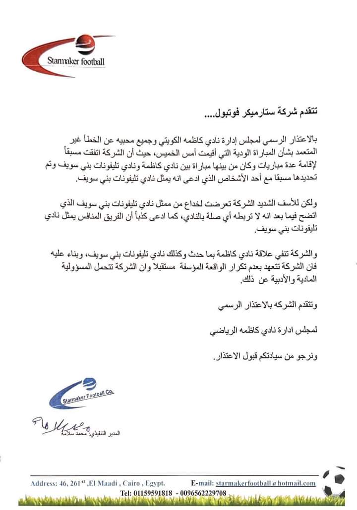 تتقدم شركة ستار ميكر فوتبول.. بالاعتذار الرسمي لمجلس إدارة نادي كاظمة الكويتي وجميع محبيه عن الخطأ غير المتعمد بشأن المباراة الودية التي أقيمت أمس الخميس، حيث أن الشركة اتفقت مسبقًا لإقامة عدة مباريات، وكان من بينها مباراة بين نادي كاظمة ونادي تليفونات بني سويف، وتم تحديدها مسبقًا مع أحد الأشخاص الذي ادعى أنه يمثل نادي تليفونات بني سويف.