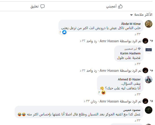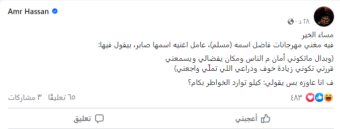 وقال حسن عبر حسابه الشخصي على فيسبوك: مغني مهرجانات فاضل اسمه مسلم، عامل أغنيه اسمها صابر، بيقول فيها، وبدال ما تكوني أمان من الناس ومكان يفضالي ويسمعني، قررتي تكوني زيادة خوف ودراعي اللي تملّي واجعني، مضيفا: أنا عاوزه بس يقولي، كيلو توارد الخواطر بكام؟.