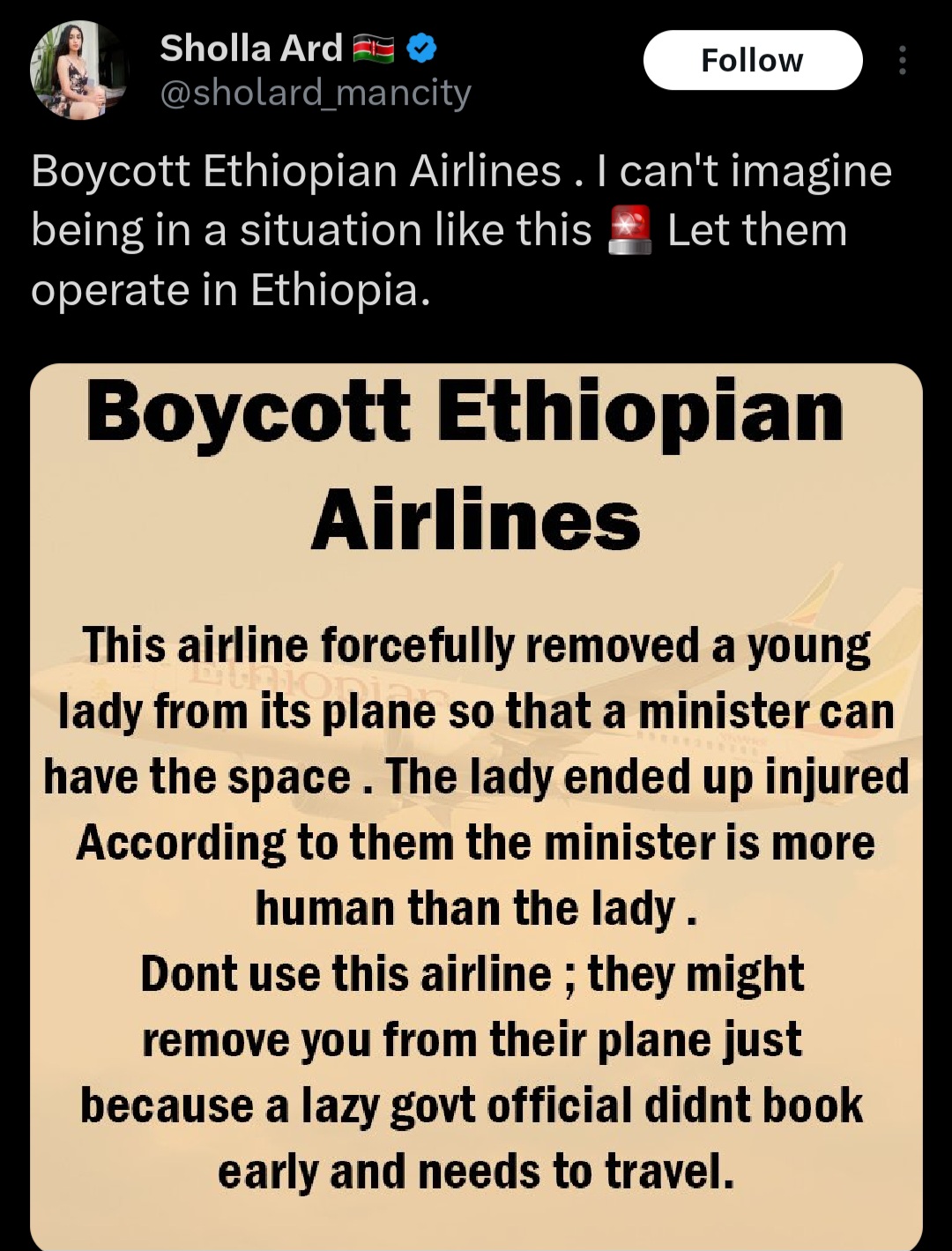 أجبر المسؤولون، راكبة على متن رحلة تابعة للخطوط الجوية الإثيوبية، على النزول من الطائرة لتفسح المجال لأحد الوزراء، الذي تم تعيينه من قبل الشركة ليسافر مكان تلك الراكبة التي احتجت بشدة على إثر ذلك، وفقًا لـ free press journal.