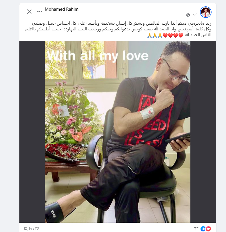 وحرص الملحن محمد رحيم على نشر صورة له في المنزل بعد مغادرته المستشفى ووجه الشكر لكل من دعاء له وسأل عليه، مؤكدًا أن حالته الصحية أصبحت جيدة، وكتب تعليقًا على الصورة عبر حسابه بموقع فيس بوك: ربنا ما يحرمني منكم أبدًا يا رب العالمين وبشكر كل إنسان بشخصه وباسمه على كل إحساس جميل وصلني وكل كلمة أسعدتني وأنا الحمد لله بقيت كويس بدعواتكم وحبكم، ورجعت البيت النهارده حبيت أطمنكم يا أغلى الناس الحمد لله.