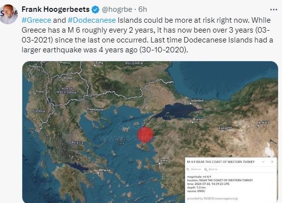 ووفقًا لعالم الزلازل الهولندي، قد تكون اليونان وجزر دوديكانيسيا أكثر عرضة للخطر في الوقت الحالين، في حين تشهد اليونان زلزالًا بقوة 6 درجات كل عامين تقريبًا، فقد مر الآن أكثر من 3 سنوات منذ وقوع الزلزال الأخير، وآخر مرة تعرضت فيها جزر دوديكانيسيا لزلزال أكبر كانت منذ 4 سنوات.
