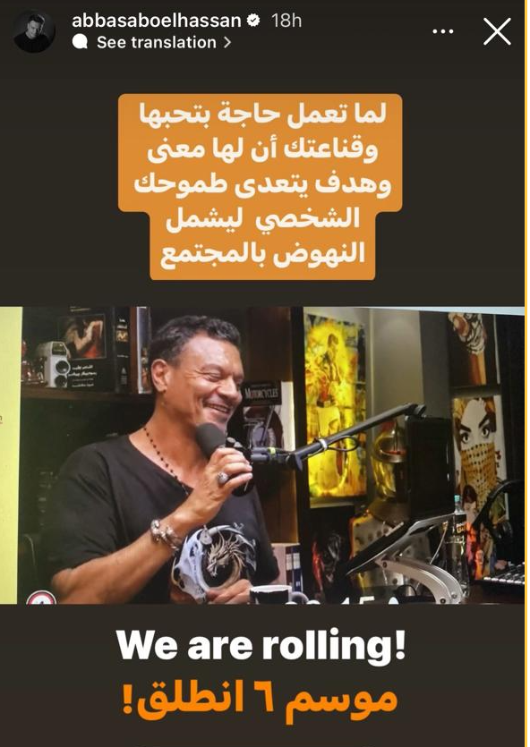 وشارك الفنان عباس أبو الحسن صورة من كواليس تصوير برنامجه بودكاست حوارات مع عباس، عبر حسابه الشخصي بموقع إنستجرام، وعلق عليه قائلًا: لما تعمل حاجة بتحبها وقناعتك أن لها معنى وهدف يتعدى طموحك الشخصي ليشمل النهوض بالمجتمع.