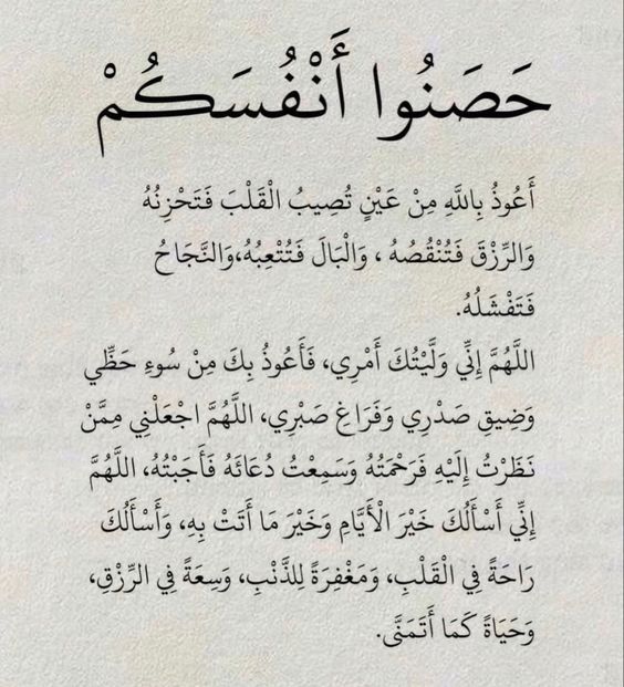 - قُلْ أَعُوذُ بِرَبِّ الْفَلَقِ* مِن شَرِّ مَا خَلَقَ * وَمِن شَرِّ غَاسِقٍ إِذَا وَقَبَ * وَمِن شَرِّ النَّفَّاثَاتِ فِي الْعُقَدِ * وَمِن شَرِّ حَاسِدٍ إِذَا حَسَدَ.