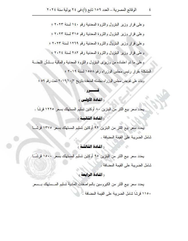 واعتبارا من الساعة السادسة صباح اليوم الخميس الموافق 25 -7 - 2024 تقرر زيادة أسعار البنزين بأنواعه والسولار والمازوت الصناعي لتكون الأسعار كالتالي: