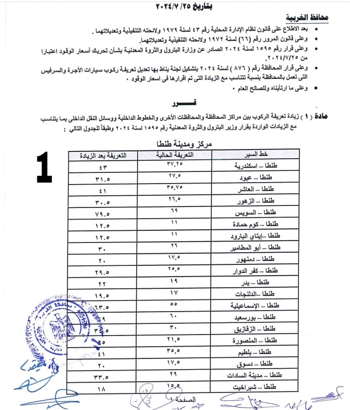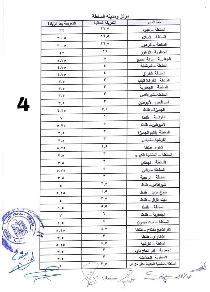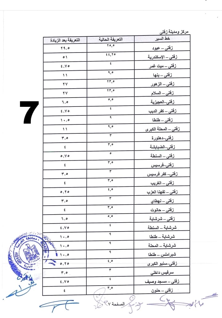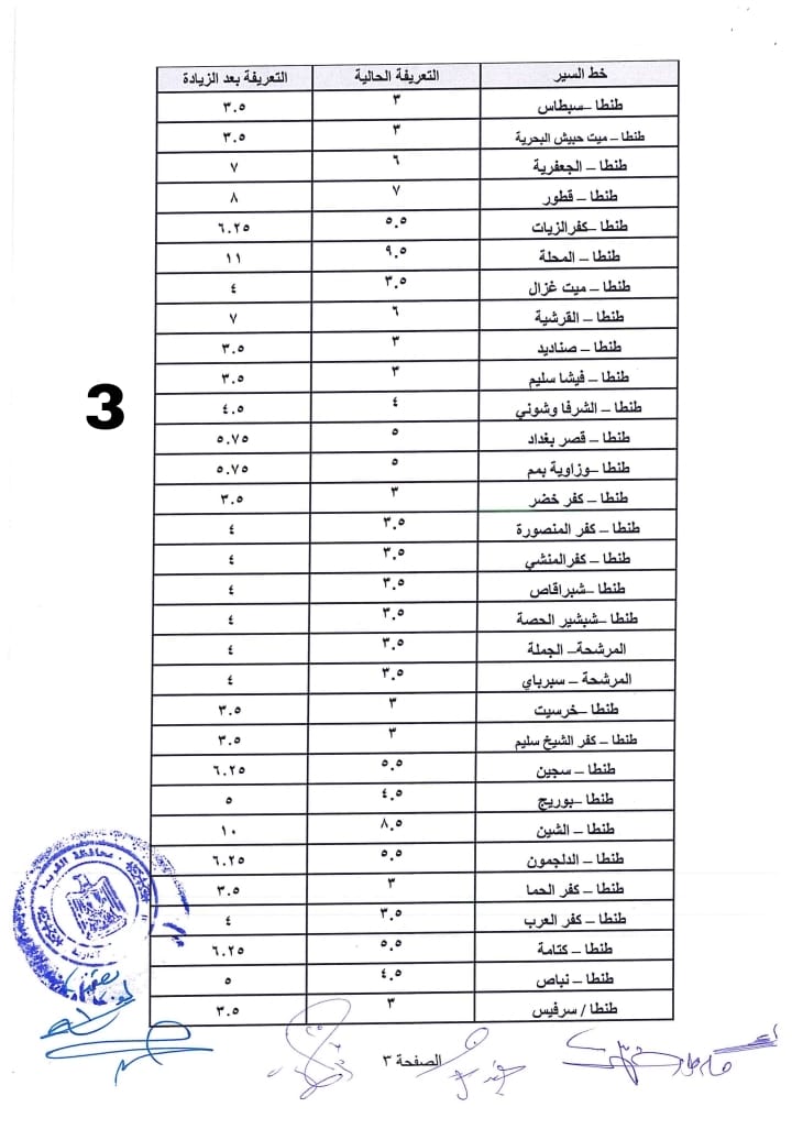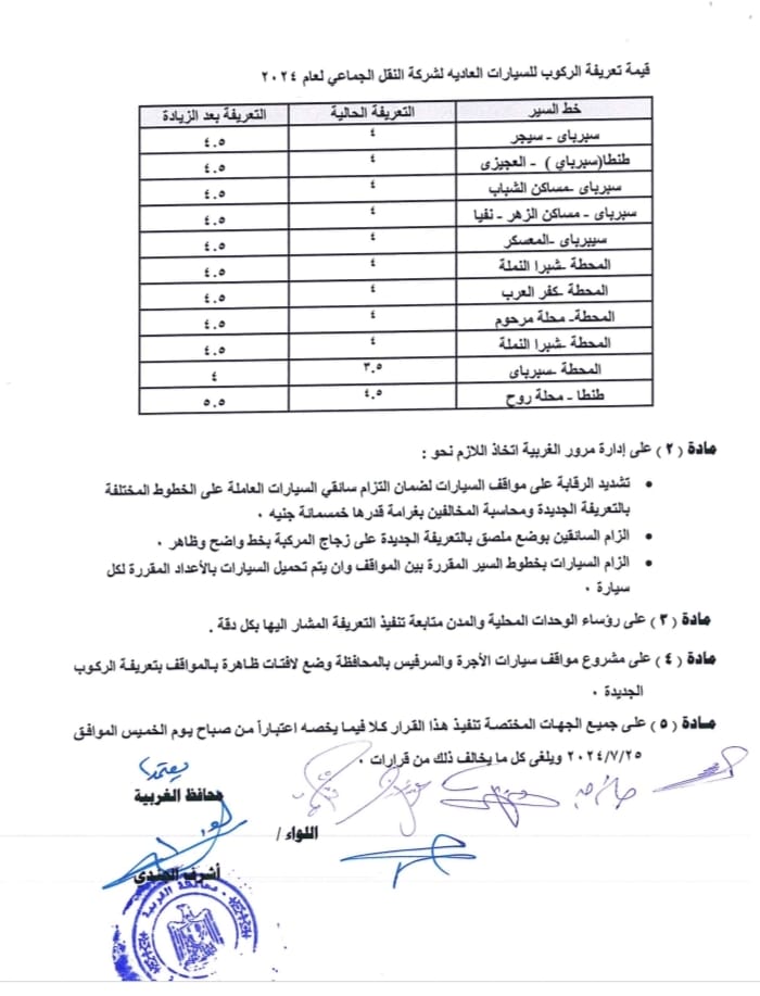ونص قرار محافظ الغربية على زيادة تعريفة الركوب لوسائل المواصلات لجميع الخطوط الداخلية بالمحافظة والخارجية بين المحافظات، بما يتناسب مع الزيادة المقررة.