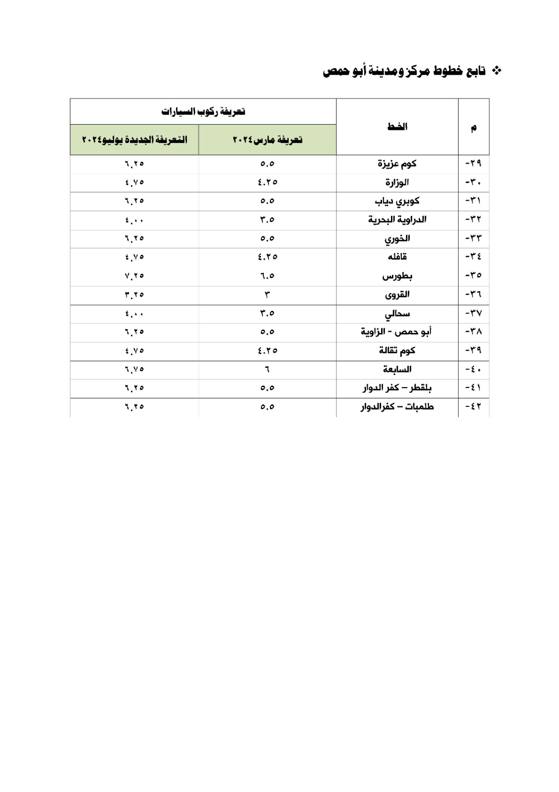 - قيمة تذكرة مركبات مشروع النقل الداخلي من 3.50 جنيه لتصبح 4 جنيهات.