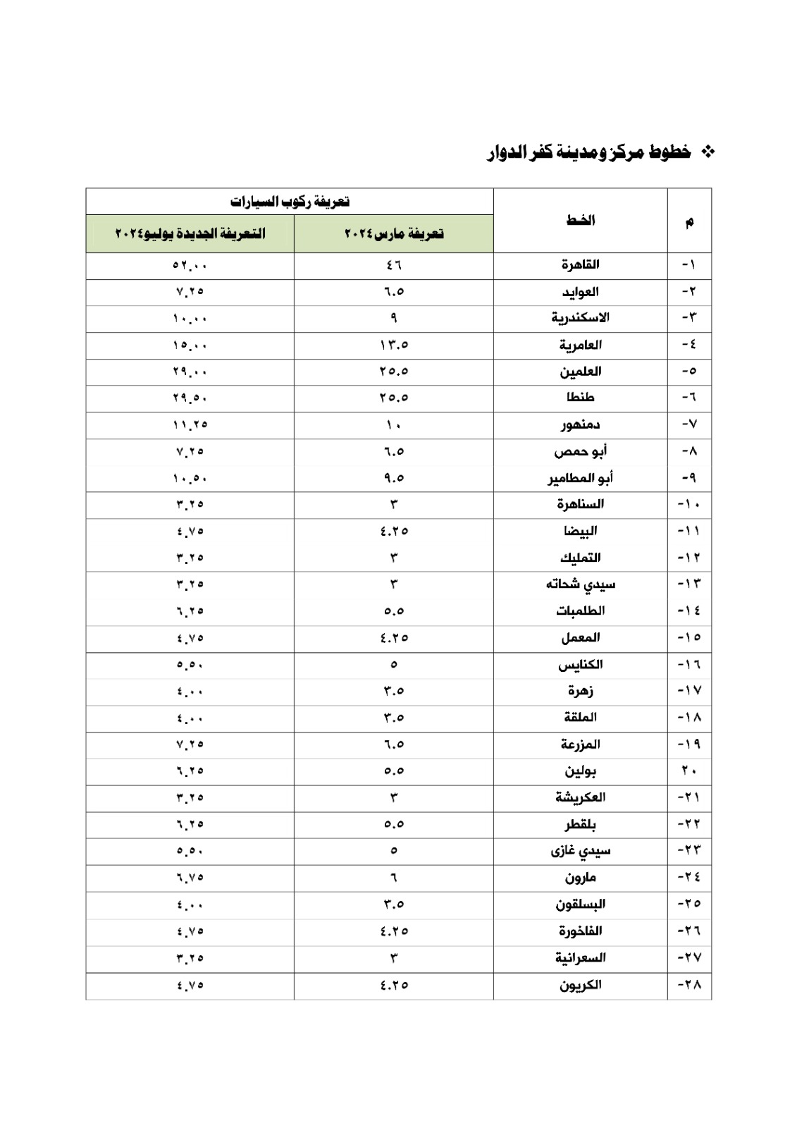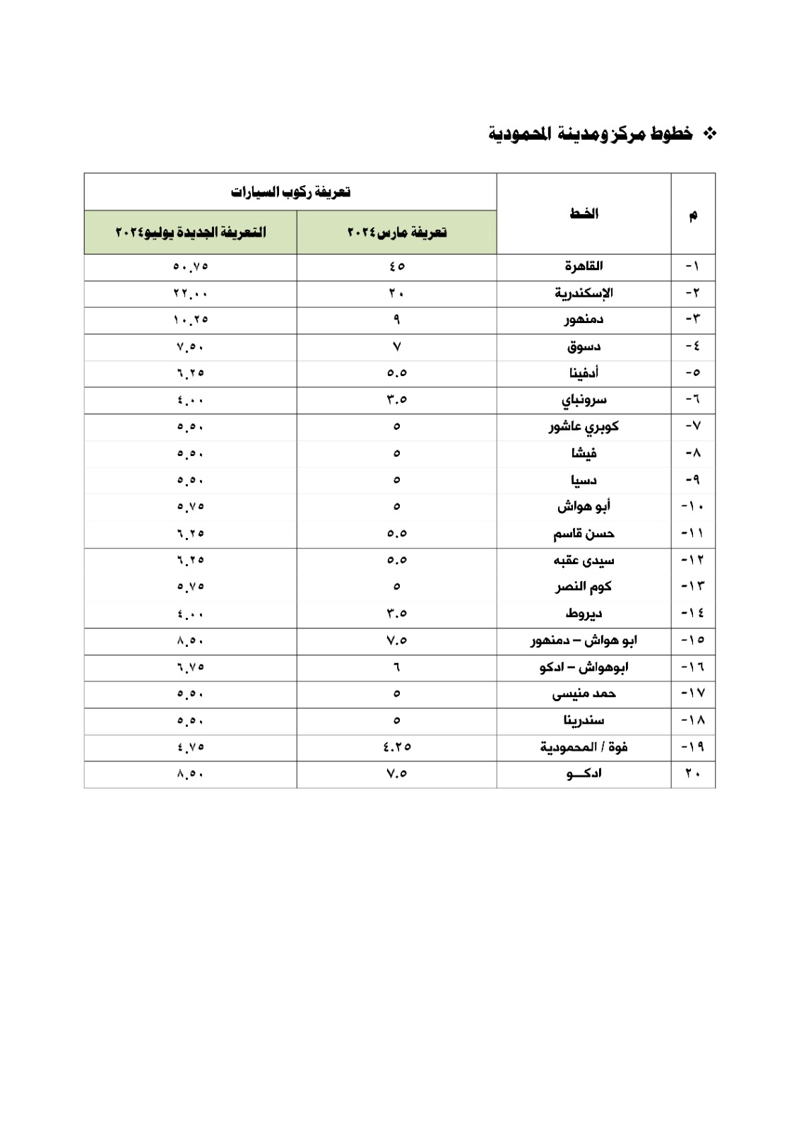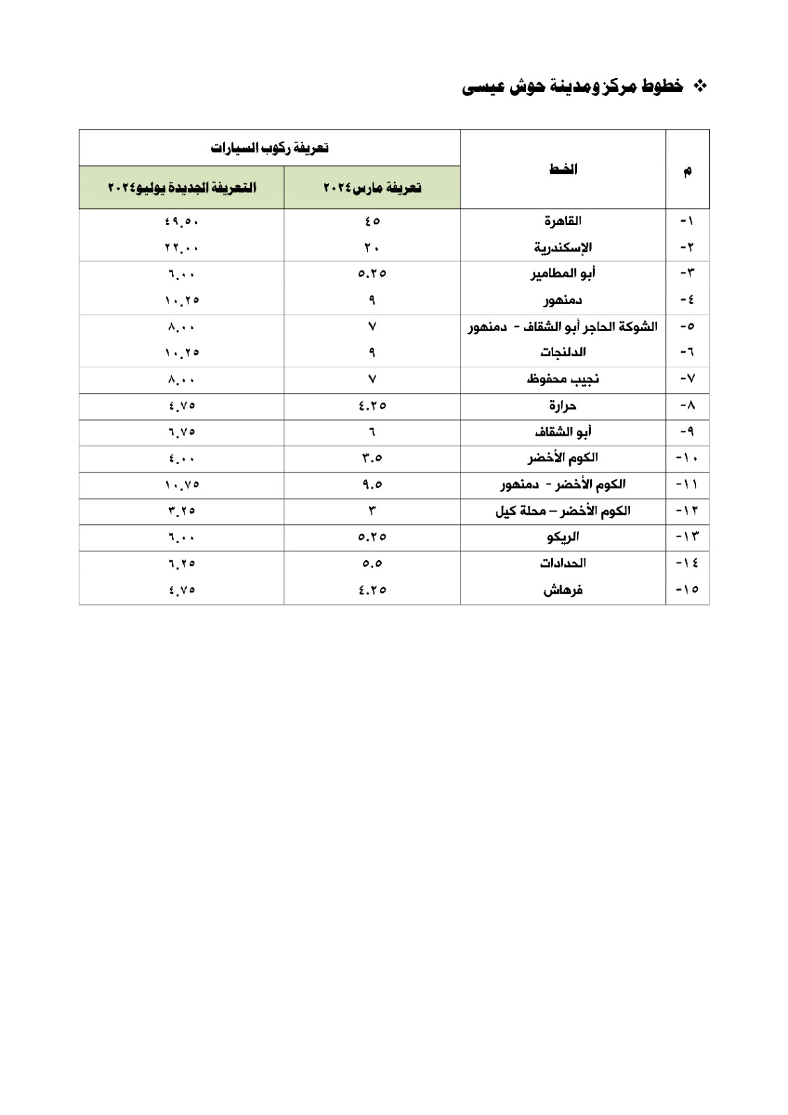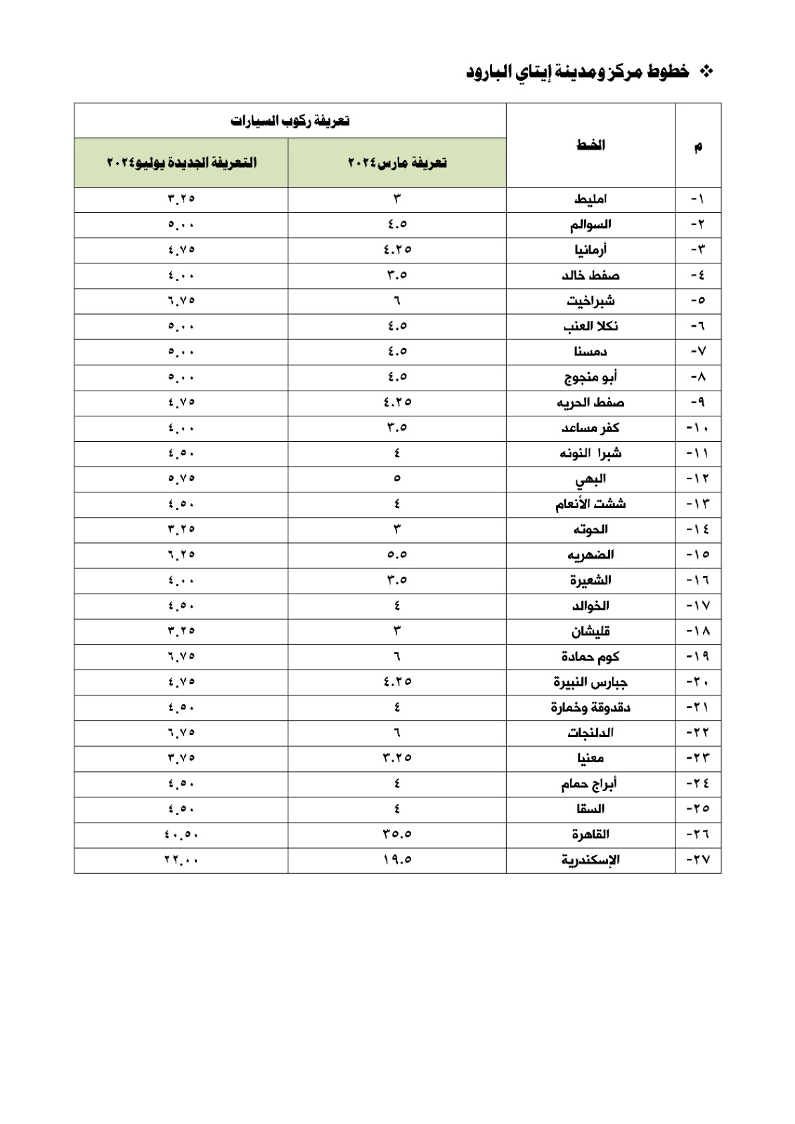 وتم زيادة تعريفة ركوب السيارات الأجرة العاملة على الخطوط الداخلية والخارجية بين مراكز المحافظة بعضها البعض وبينها وبين المحافظات الأخرى، وجاءت زيادة تعريفة ركوب السيارات والمركبات المبينة على النحو التالى:-