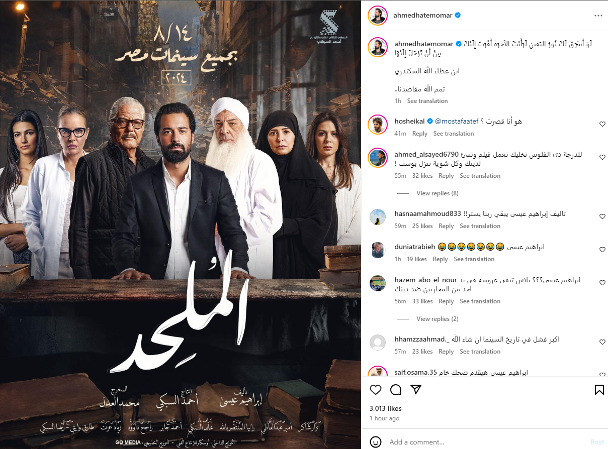 ومن كلمات ابن عطاء الله السكندري، روج الفنان أحمد حاتم، لـ فيلمه الجديد الملحد، وكتب عبر حسابه الشخصي على موقع تبادل الصور والفيديوهات انستجرام: لَوْ أَشْرَقَ لَكَ نُورُ اليَقِينِ لَرَأْيْتَ الآخِرَةَ أَقْرَبَ إِلَيْكَ مِنْ أَنْ تَرْحَلَ إِلَيْهَا لَوْ أَشْرَقَ لَكَ نُورُ اليَقِينِ.