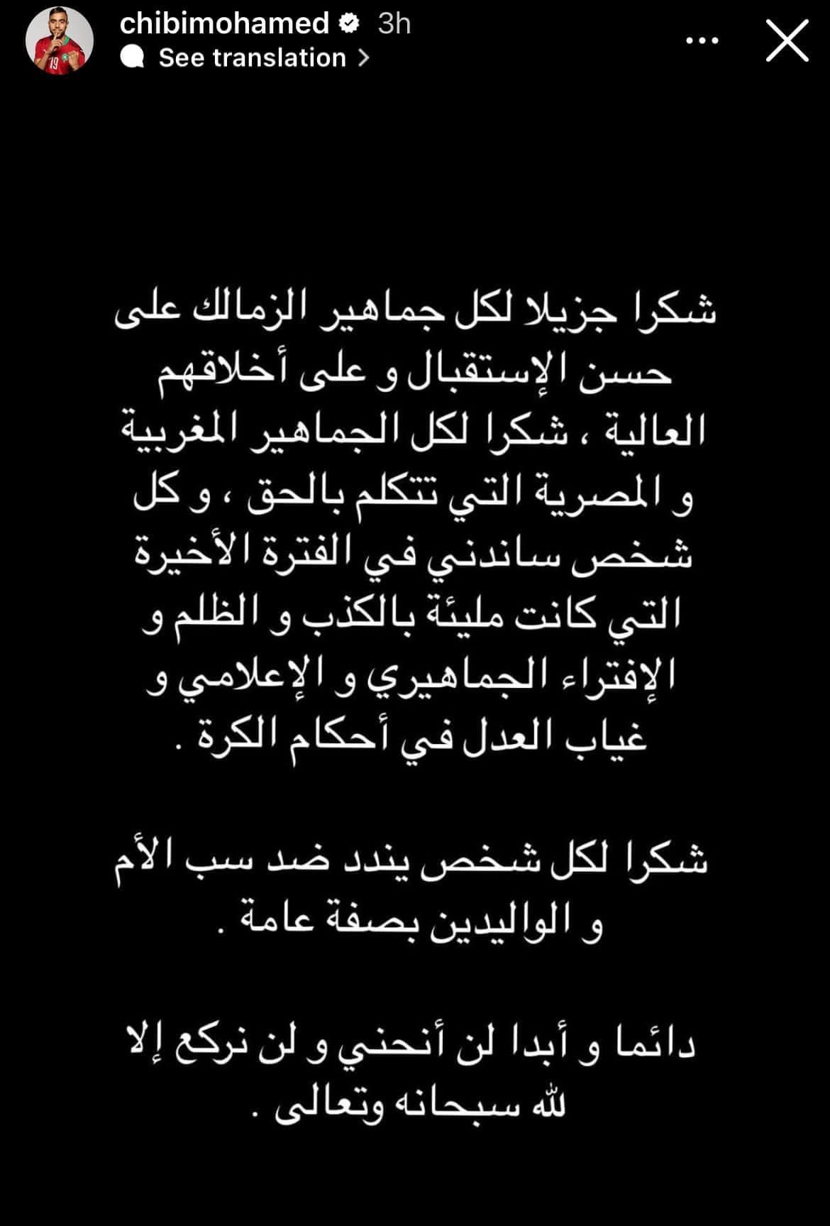 كتب محمد الشيبي عبر حسابه الرسمي على موقع إنستجرام: شكرًا جزيلًا لكل جماهير الزمالك على حسن الاستقبال وعلى أخلاقهم العالية، شكرًا لكل الجماهير المغربية والمصرية التي تتكلم بالحق.