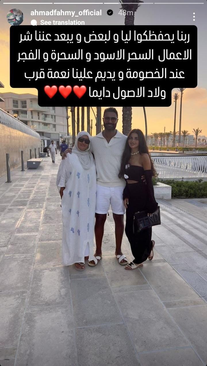 ونشر أحمد فهمي صورة لشقيقه الفنان كريم فهمي مع زوجته، ودعا الله أن يبعد عنهم السحر والأعمال حيث كتب: ربنا يحفظكوا ليا ولبعض ويبعد عننا شر الأعمال والسحر الأسود والسحرة والفجر عند الخصومة، ويديم علينا نعمة قرب ولاد الأصول دايمًا.