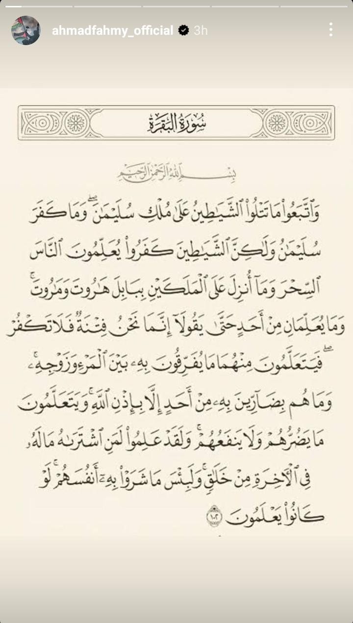 كما نشر أحمد فهمي مجموعة من الآيات القرآنية التي تقي من السحر وذلك عبر ستوري حسابه بموقع تبادل الصور والفيديوهات إنستجرام.