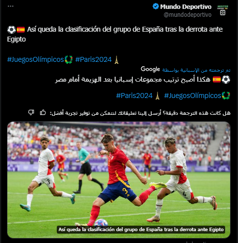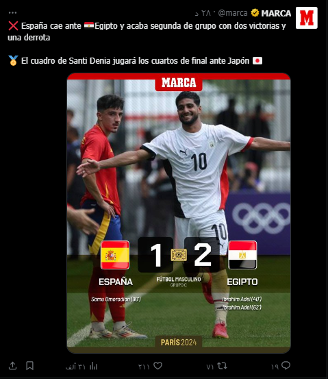قالت صحيفة MARCA الإسبانية: إسبانيا تسقط أمام مصر وتحتل المركز الثاني في المجموعة بفوزين وخسارة واحدة، سيلعب فريق سانتي دينيا في الدور ربع النهائي ضد اليابان.