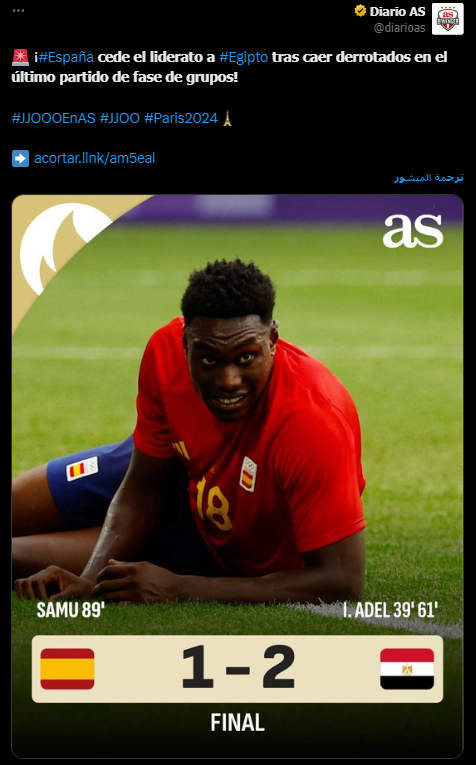 عنونت صحيفة As Diario الإسبانية: المنتخب يتخلى عن الصدارة لـ المصريين بعد هزيمته في المباراة الأخيرة في دور المجموعات!.