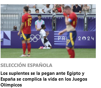 تناولت صحيفة SPORT 45 الإسبانية، هزيمة الماتادور من الفراعنة كالتالي: إسبانيا خسرت أمام مصر 2-1 وأنهت مشاركتها في دور المجموعات بدورة الألعاب الأولمبية باريس 2024، حيث اختار المدرب سانتي دينيا إحداث ثورة في التشكيلة، بتغيير عشرة لاعبين.