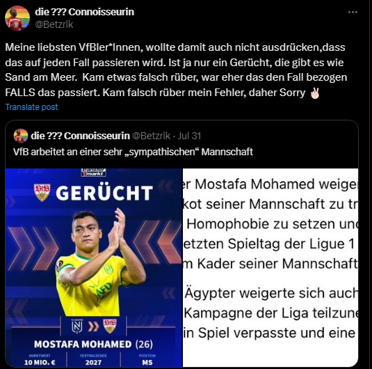 وبعد تلك التويتة، أعاد الشخص الذي يدعم المثليين منشوره عن مصطفى محمد وقال: أعزائي أعضاء نادي شتوتجارت، لم أرغب في التعبير عن أن هذا سيحدث بالتأكيد، إنها مجرد إشاعة، هذا خطأي، آسف جدًا.