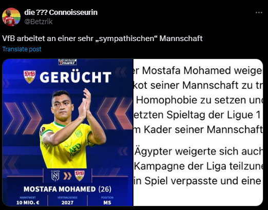 وعقب ارتباط اسمه بنادي شتوتجارت الألماني، نشر أحد الأشخاص الذين يدعمون المثليين عبر حسابه الرسمي على موقع إكس، تويتة تفيد بأن مهاجمنا المصري مصطفى محمد رفض ارتداء قميص دعم المثليين مع فريقه نانت من أجل التأثير على مسيرة المهاجم.