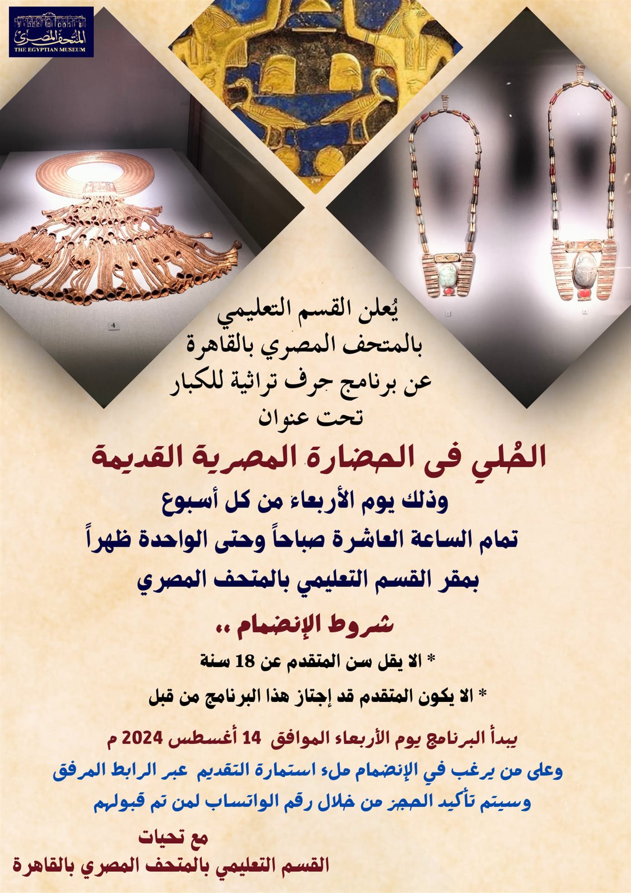 ينظم المتحف المصري بالتحرير، محاضرات عن برنامج حرف تراثية للكبار تحت عنوان الحُلي في الحضارة المصرية القديمة.