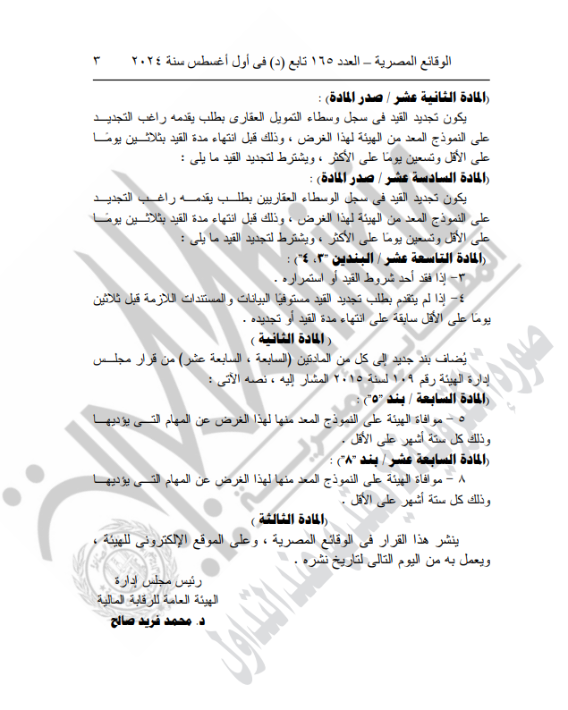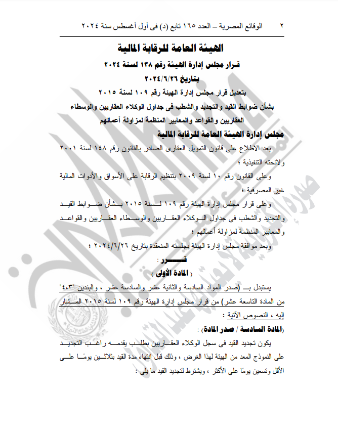 نشرت الجريدة الرسمية في عددها الصادر اليوم، قرار هيئة الرقابة المالية رقم 138 لسنة 2024، الخاص بتعديل قرار مجلس إدارة الهيئة رقم 109 لسنة 2015 بشأن ضوابط القيد والتجديد والشطب في جداول الوكلاء العقاريين والوسطاء العقاريين والقواعد والمعايير المنظمة لمزاولة أعمالهم.