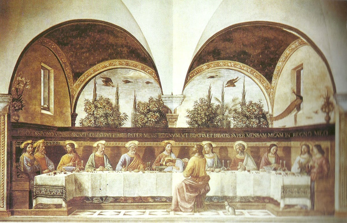 أبرزهم لوحة فنان عصر النهضة الإيطالي دومينيكو جيرلاندايو التي تقع في قاعة دير أوجنيسانتي في بورجو أو جنيسانتي رقم 42 في وسط فلورنسا بمنطقة توسكانا في إيطاليا، فيما إنها واحدة من 3 لوحات جدارية للعشاء الأخير رسمها جيرلاندايو في فلورنسا، والآخرون تم تعليقهم في كنيسة باديا دي باسيجنانو عام 1476 وكنيسة لسيناكولو دي سان ماركو 1486.