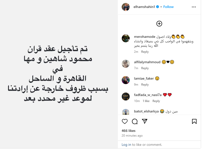 وكتبت إلهام شاهين، منشورًا عبر حسابها الشخصي بموقع تبادل الصور والفيديوهات إنستجرام: تم تأجيل عقد قران محمود شاهين ومها في القاهرة والساحل بسبب ظروف خارجة عن إرادتنا لموعد غير محدد بعد.