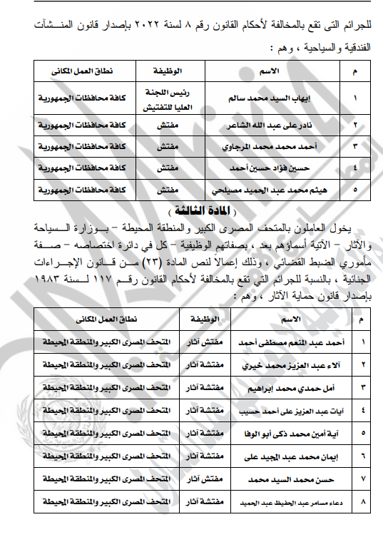 وجاء في المادة الثالثة يخول العاملون بالمتحف المصرى الكبير والمنطقة المحيطة بوزارة السياحة والآثار الآتية أسماؤهم بعد، بصفاتهم الوظيفية - كل في دائرة اختصاصه - صفة مأموري الضبط القضائي، وذلك إعمالا لنص المادة (23) من قانون الإجراءات الجنائية، بالنسبة للجرائم التي تقع بالمخالفة لأحكام القانون رقم 117لسنة 1983 بإصدار قانون حماية الآثار.