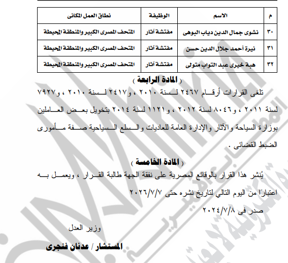 وجاء في المادة الرابعة تلغى القرارات أرقام 2467لسنة 2010، و2417لسنة 2010، و7927لسنة 2011، و8046لسنة 2012، و1121لسنة 2014بتخويل بعض العاملين بوزارة السياحة والآثار والإدارة العامة للعاديات والسلع السياحية صفة مأمورى الضبط القضائي