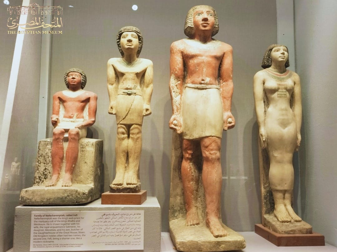 وقالت إدارة المتحف المصري بالتحرير، في بيان لها، إن الكاهن يظهر في التماثيل بصحبة زوجته سات ـ مرت المعروفة لدى الملك وابنته مرت - إيت - إس وابنه إتي - من الجزار في مذبح القصر الملكي، وغالبًا ما كان للنبلاء في عصر الدولة القديمة اسمان، والاسم الثاني لصاحب التمثال هو ففي، وهو اسم قصير يشبه اسم التدليل في العصر الحديث.