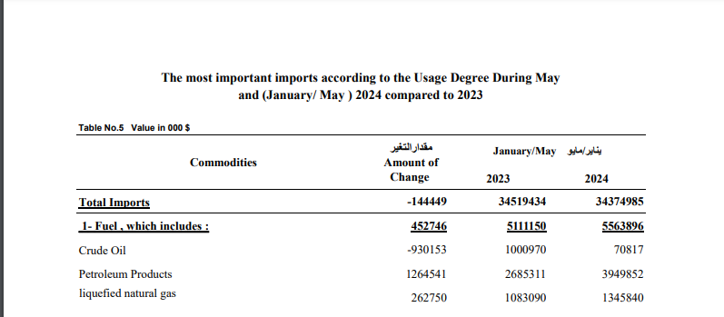 ارتفعت قيمة إجمالي واردات مصر من المنتجات البترولية بواقع 1.3 مليار دولار، خلال أول 5 أشهر من العام الجاري 2024 مقارنة بنفس الفترة من 2023.
