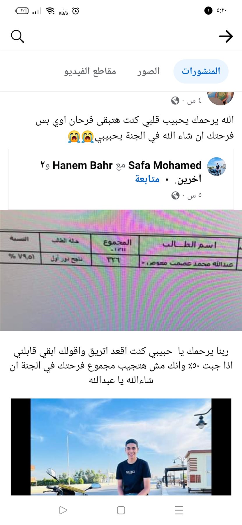 كما نشر أحد زملاء عبدالرحمن على مواقع التواصل الاجتماعي فيس بوك نتيجة الثانوية العامة الخاصة به مرددًا " كان نفسي تكون موجود ونفرح سوا ياصاحبي" وبدعيلك بالجنة.