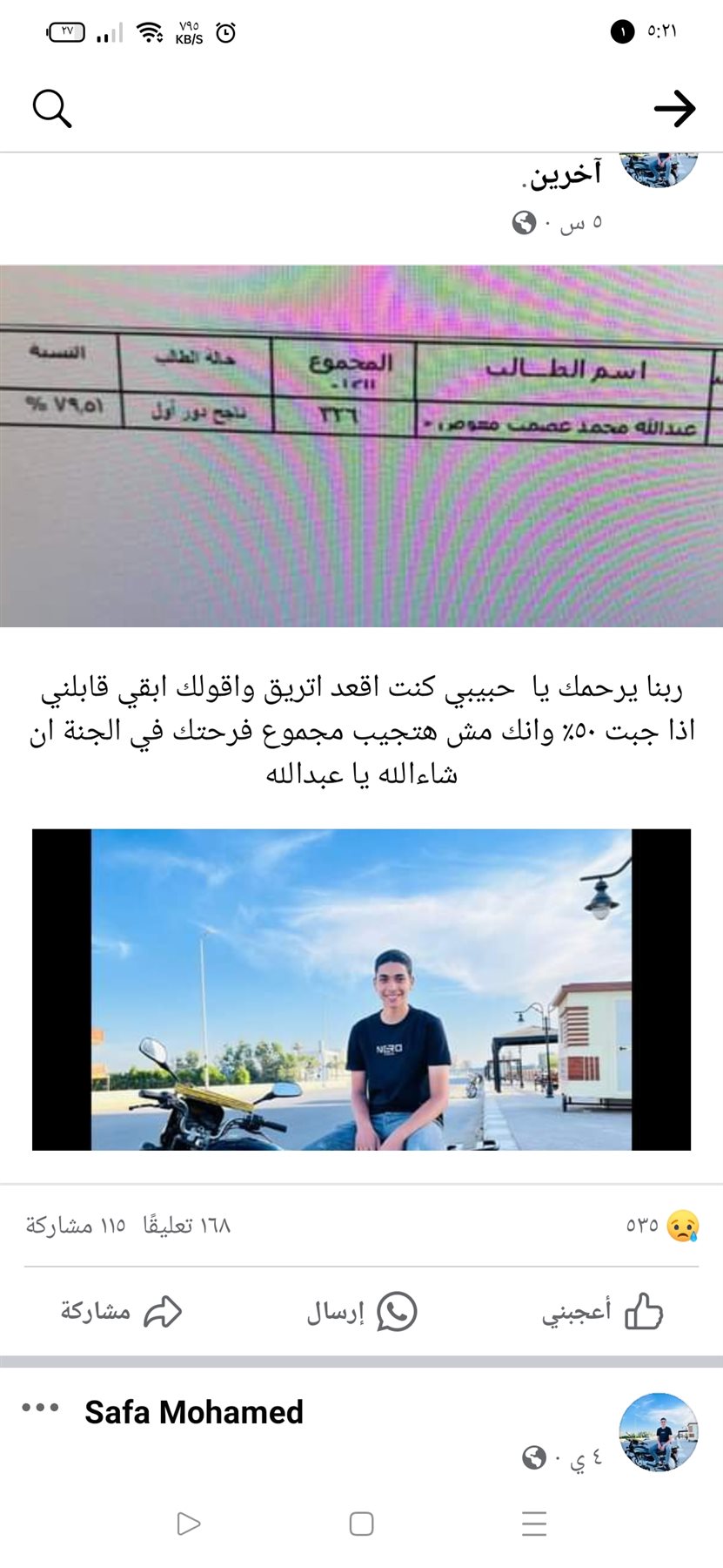 وتابع، اليوم ظهرت النتيجة، وحصل صاحبي عبدالرحمن على مجموع 79.5، ولكنه لم يشاهد النتيجة وفرحته أكيد في الجنه.