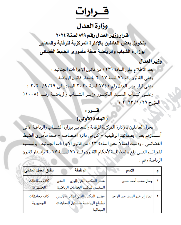 يأتي هذا القرار بعد الاطلاع على المادة 23 من قانون الإجراءات الجنائية، وعلى القانون رقم 71 لسنة 2017 بإصدار قانون الرياضة، وعلى قرار وزير العدل رقم 6741 لسنة 2020 الصادر في 29 /9 / 2020 وعلى كتاب السيد الدكتور وزير الشباب والرياضة رقم 11008 المؤرخ 29 / 1 / 2023.
