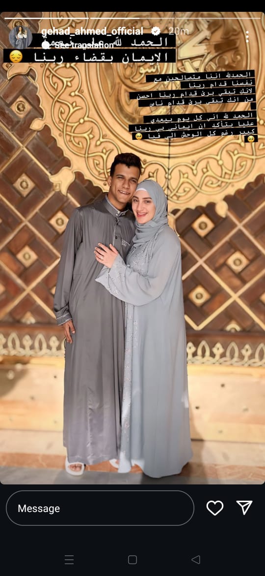 ونشرت زوجة عصام صاصا، صورًا جمعتهما عبر حسابها الشخصي على إنستجرام، وكتبت: الحمد لله على نعمة الإيمان بقضاء ربنا، الحمد لله إننا متصالحين مع نفسنا قدام ربنا، إنك تبقى بريء قدام ربنا أحسن من أنك تبقى بريء قدام الناس، الحمد لله إن كل يوم بيعدي بتأكد أن إيماني بـ ربنا كبير رغم الوحش اللي فيا.