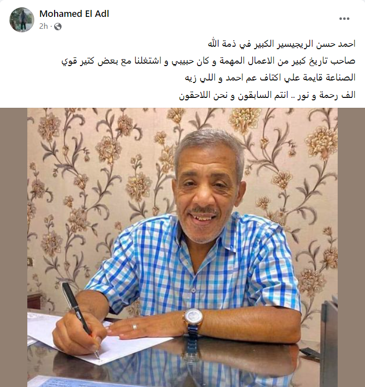 وكتب ماندو العدل، منشورًا عبر حسابه الشخصي بموقع التواصل الاجتماعي فيسبوك، قال فيه: أحمد حسن الريجيسير الكبير في ذمة الله صاحب تاريخ كبير من الأعمال المهمة وكان حبيبي واشتغلنا مع بعض كتير قوي الصناعة قايمة على أكتاف عم أحمد واللي زيه.. ألف رحمة ونور أنتم السابقون ونحن اللاحقون.
