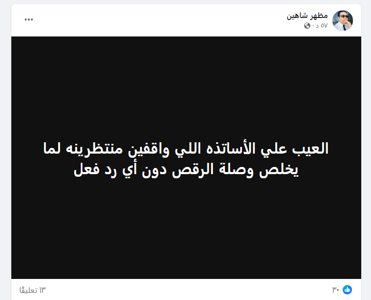 وقال الشيخ مظهر شاهين، في منشور له على صفحته الشخصية، إن العيب على الأساتذة الواقفين أمامه في انتظاره، لحين انتهاء الطالب من وصلة الرقص، دون إبداء أي رد فعل.