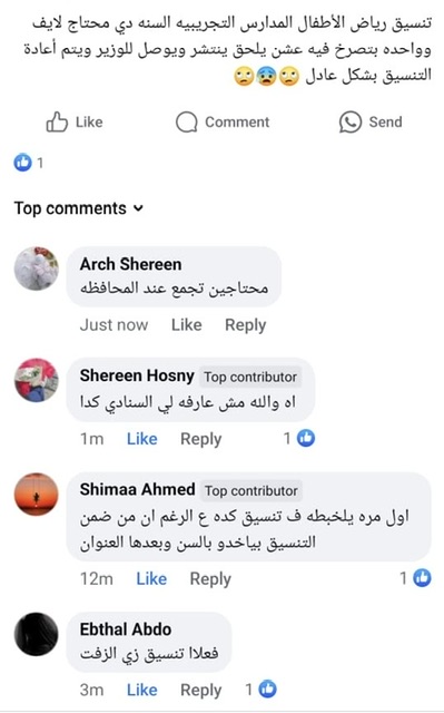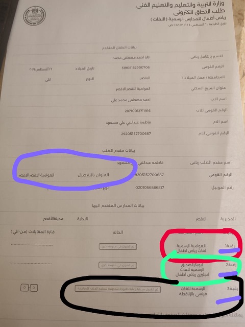 وقالت قمر مصطفى والدة إحدى الأطفال لـ القاهرة 24: قدمت لابنتي لانا رغبة أولى مدرسة طيبة الرسمية المتميزة لغات رياض أطفال؛ نظرًا لأننا نقطن في مدينة طيبة، ورغبة ثانية العوامية، إلا أننا وجدنا خيارًا ثالثًا إجباريًا يجب ملؤه في الرغبات، فاخترت المدرسة الفرنسية بالزناقطة لإنهاء ملء الرغبات.