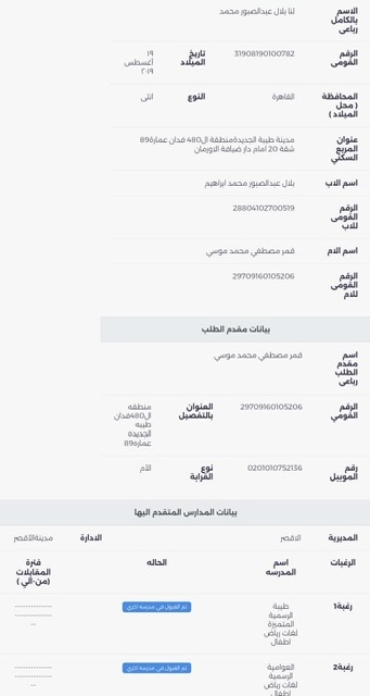 وأضاف والد تاليا: لكن فوجئت أنهم تركوا الرغبة الأولى والثانية، وأخذوا الثالثة، التي وضعها السيستم تلقائيًا وإجباريًا فقط لملء البيانات لا أكثر، دون مراعاة للسن أو حتى للتوزيع الجغرافي، وعندما سألنا في الإدارة التعليمية أخبرونا إن ده تنسيق إلكتروني ملناش فيه، ومستقبل أولادنا هيضيع بسبب موظفة يجب محاسبتها.
