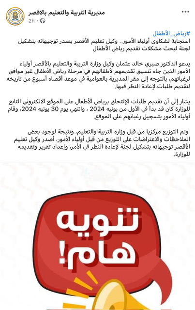 وعلقت مديرية التربية والتعليم بالأقصر بمنشور لها على صفحتها الرسمية بخصوص هذا الشأن، استجابة لشكاوى أولياء أمور رياض الأطفال، وجه وكيل وزارة التربية والتعليم بالأقصر الدكتور صبري خالد، بتشكيل لجنة لبحث مشكلات تقديم رياض الأطفال.