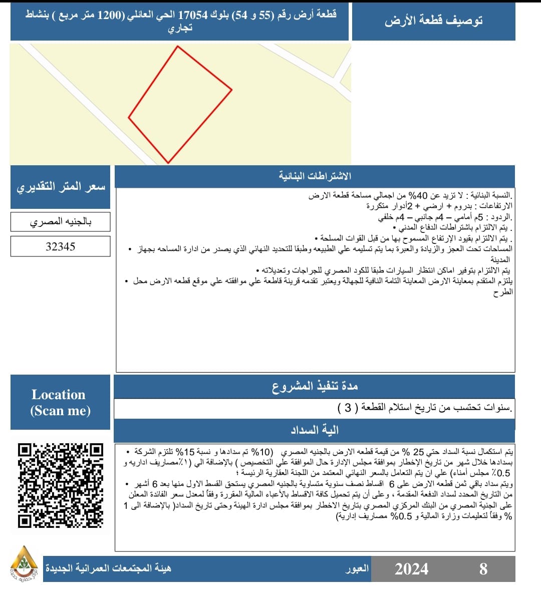 وأكد رئيس الجهاز أن المساحة تحت العجز والزيادة طبقًا للتحديد النهائي الذي يصدر من إدارة المساحة بجهاز المدينة، مع ضرورة الاطلاع على كتيب إجراءات التخصيص بنظام التخصيص المباشر على الموقع الإلكتروني لموقع هيئة المجتمعات العمرانية الجديدة، وذلك طبقًا للاشتراطات والتفاصيل المذكورة بكروت التوصيف المرفقة.
