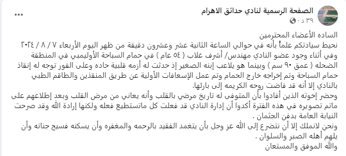 وجاء في صفحة نادي حدائق الأهرام على موقع التواصل الاجتماعي فيس بوك: في حوالي الساعة 12:20 دقيقة من ظهر اليوم الأربعاء 7 / 8/ 2024، وفي أثناء وجود عضو النادي مهندس أشرف غلاب، 54 عاما، في حمام السباحة الأوليمبي في المنطقة الضحلة عمق 90 سم، وبينما هو يلاعب ابنه الصغير حدثت له أزمة قلبية حادة.