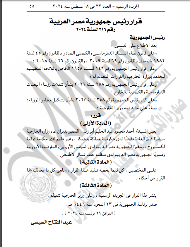 وفي سياق آخر، كانت الجريدة الرسمية نشرت قرار رئيس الجمهورية رقم 321 لسنة 2024، بتكليف المستشار محمد الفيصل يوسف أحمد بالقيام بأعمال رئيس الجهاز المركزي للمحاسبات بدرجة وزير، لمدة عام اعتبارًا من اليوم 7-8-2024.