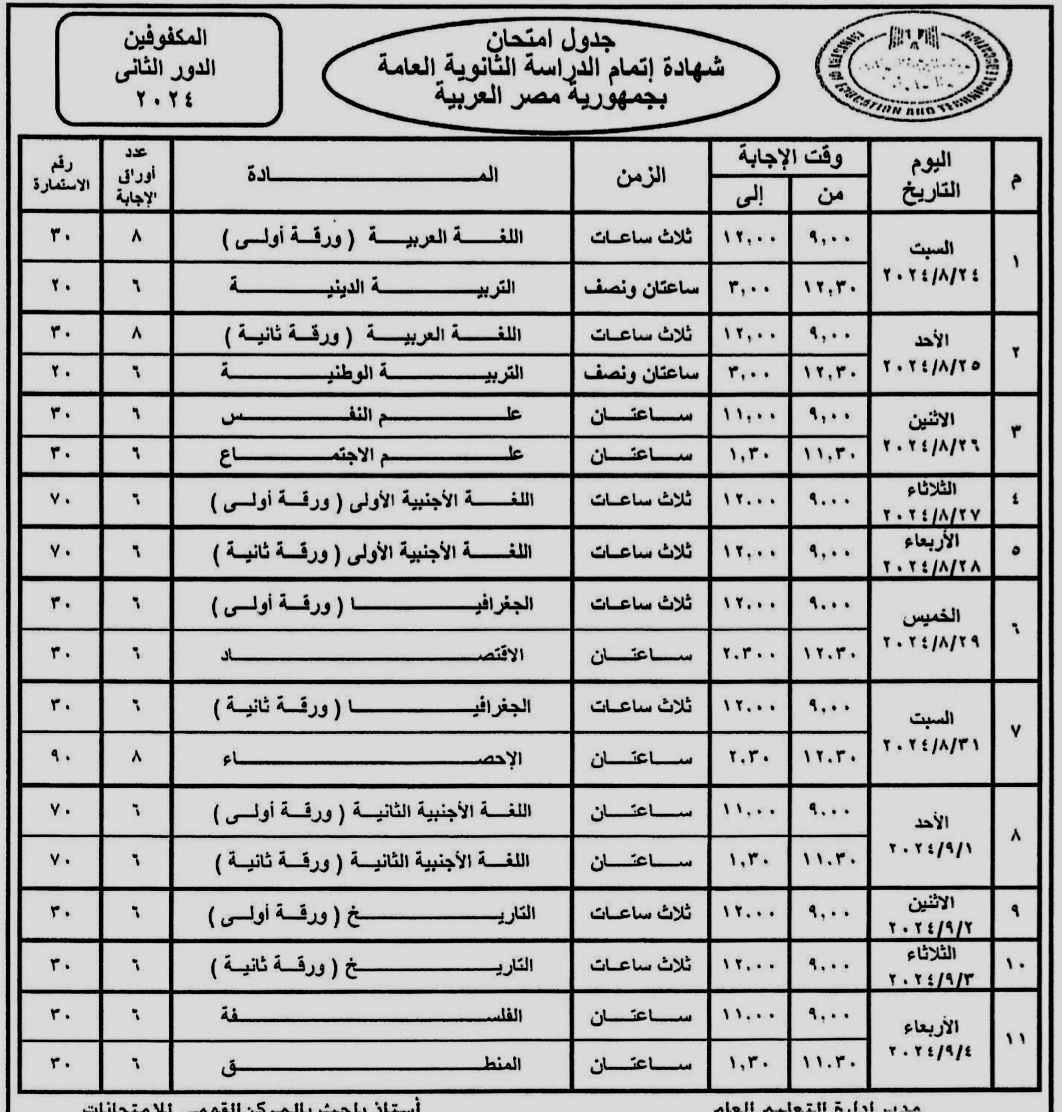 تبدأ امتحانات الثانوية العامة 2024 الدور الثاني يوم 24 أغسطس بمادة اللغة العربية والتربية الدينية، وفقًا للجدول المعلن من قبل وزارة التربية والتعليم والتعليم الفني.