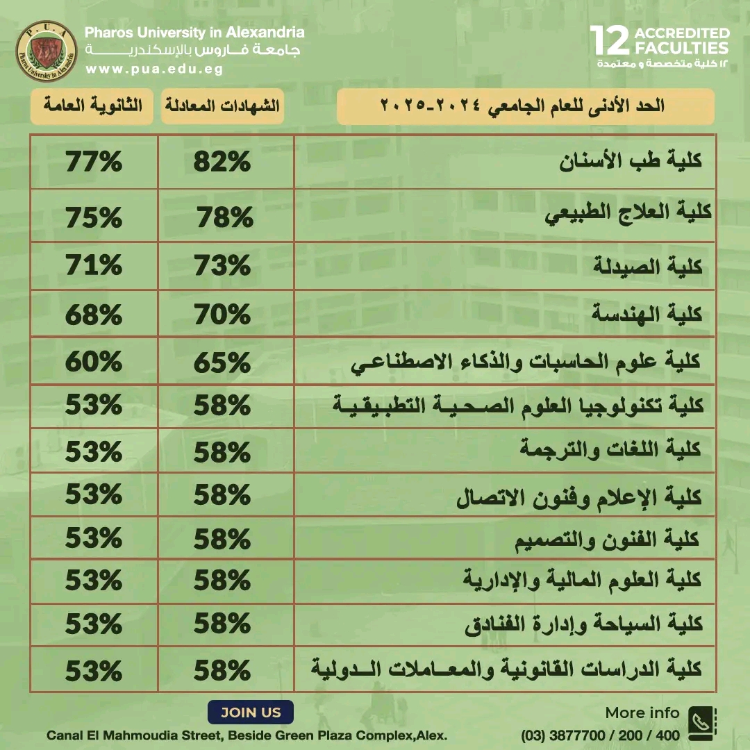 وحول تنسيق كليات جامعة فاروس 2024-2025 الشهادات المعادلة، فجاء مرتفعا مقارنة بالنسبة لتنسيق شهادات الثانوية العامة، حيث وصل الحد الأدنى للتنسيق بنسبة 58% مقارنة بالشهادة الثانوية، والتي بلغت نسبتها إلى 53%، حيث جاء الحد الأدنى للقبول بالكليات كالتالي: