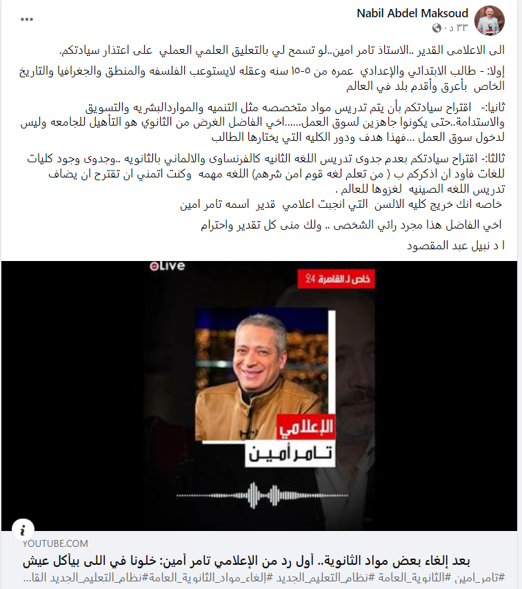 وقال الدكتور نبيل عبد المقصود في منشوره: إلى الإعلامي القدير، الأستاذ تامر أمين، لو تسمح لي بالتعليق العلمي على اعتذار سيادتكم، طالب الابتدائي والإعدادي عمره من 5 لـ 15 عاما، وعقله لا يستوعب الفلسفة والمنطق والجغرافيا والتاريخ الخاص بأعرق وأقدم بلد في العالم.