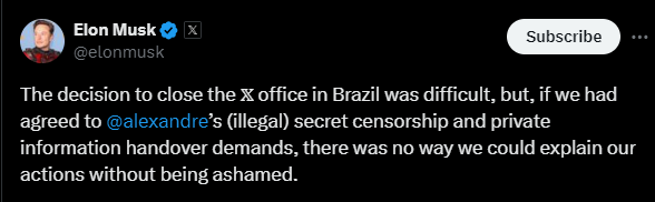 ونشر الملياردير الأمريكي إيلون ماسك على حسابه الرسمي عبر صفحته على X، قائلًا: كان قرار إغلاق مكتب X في البرازيل صعبًا، ولكن لو وافقنا على ذلك في ظل الرقابة السرية (غير القانونية) وتسليم المعلومات الخاصة، لن يكون هناك طريقة يمكننا من خلالها تفسير أفعالنا دون أن نشعر بالخجل.