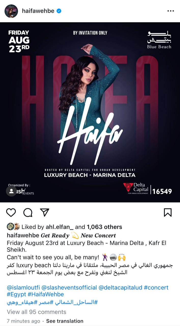 وشاركت هيفاء وهبي بوستر الحفل - عبر حسابها الشخصي على موقع التواصل الاجتماعي فيسبوك - وعلقت عليه قائلة: جمهوري الغالي في مصر الحبيبة، ملتقانا في مارينا دلتا كفر الشيخ، لنغني ونفرح مع بعض يوم الجمعة الموافق 23 أغسطس.