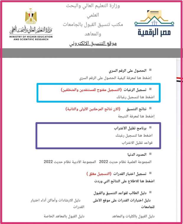 وبدأ اليوم تفعيل رابط تسجيل الرغبات لطلاب المرحلة الثانية لتنسيق الكليات 2024 رسميًا عبر موقع التنسيق الالكتروني، وينتهي التسجيل لجميع طلاب المرحلة الثانية يوم السبت القادم الموافق لـ 24 أغسطس 2024.