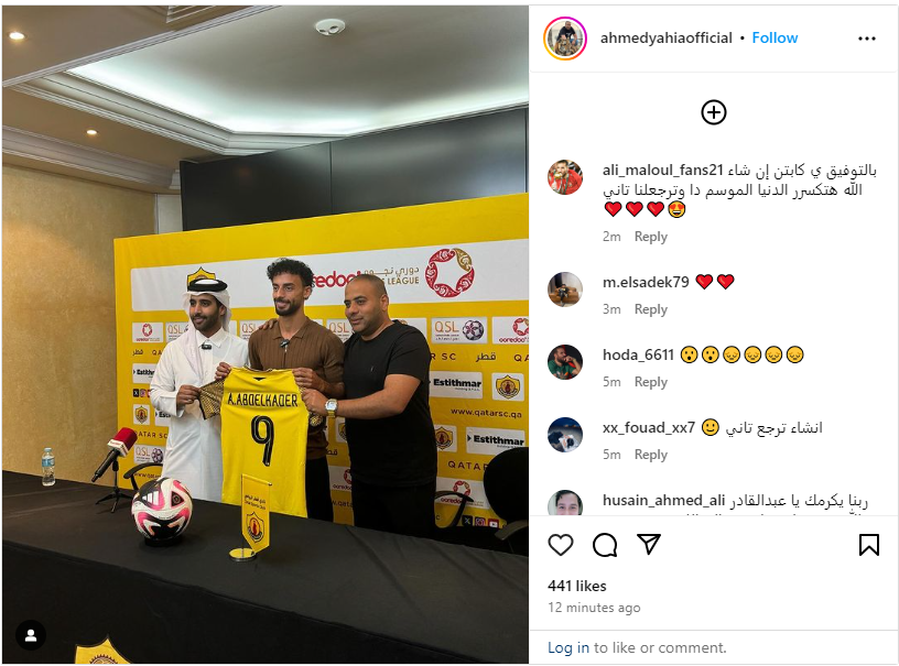 ونشر أحمد يحيي وكيل أحمد عبد القادر، عبر حسابه الرسمي على موقع التواصل الاجتماعي إنستجرام، صورة للاعب المصري من تقديمه كلاعب في صفوف نادي قطر القطري.