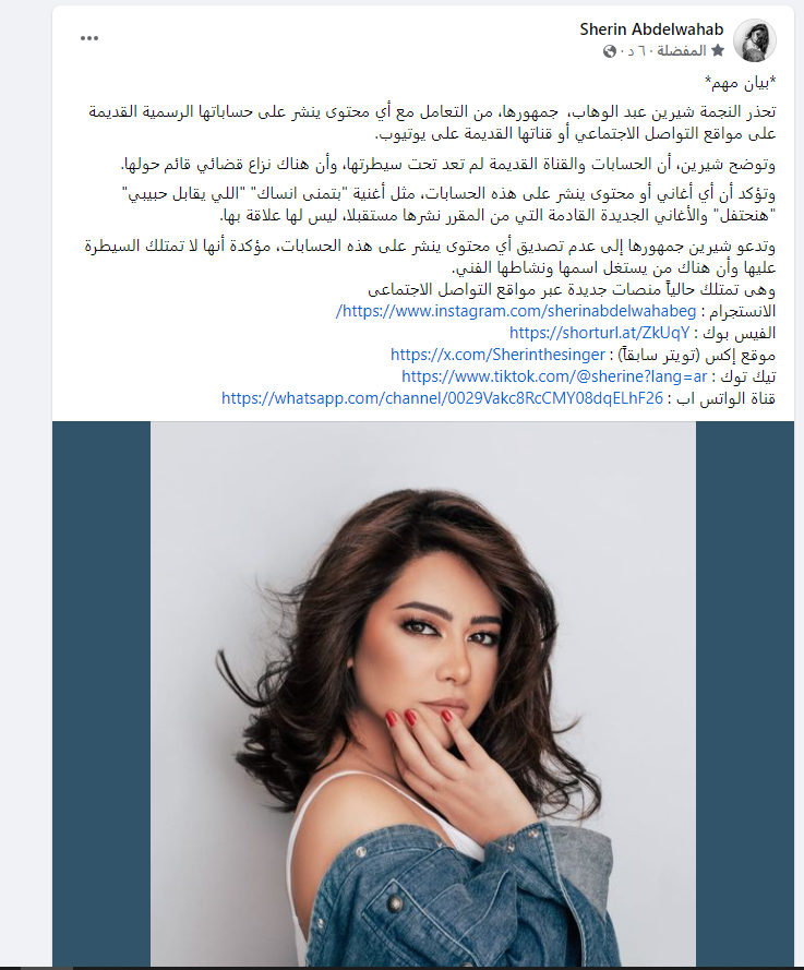 أصدرت النجمة شيرين عبد الوهاب، بيانًا عبر صفحتها الرسمية الجديدة بموقع فيس بوك، حذرت فيه جمهورها، من التعامل مع أي محتوى ينشر على حساباتها الرسمية القديمة على مواقع التواصل الاجتماعي أو قناتها القديمة على يوتيوب.